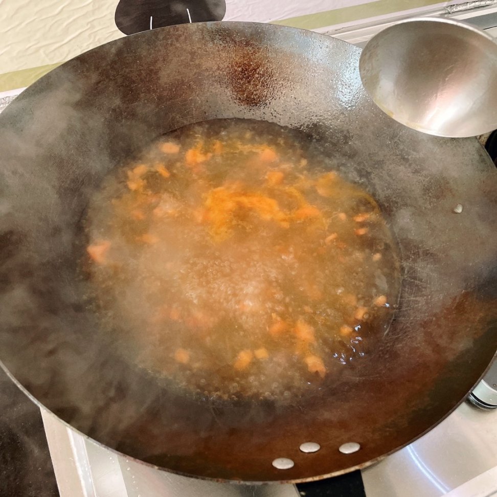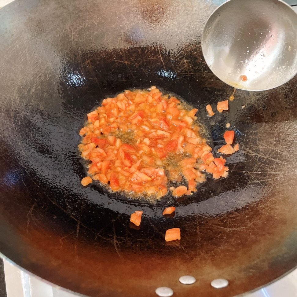 倒入番茄末和足够底汤的食盐翻炒出沙