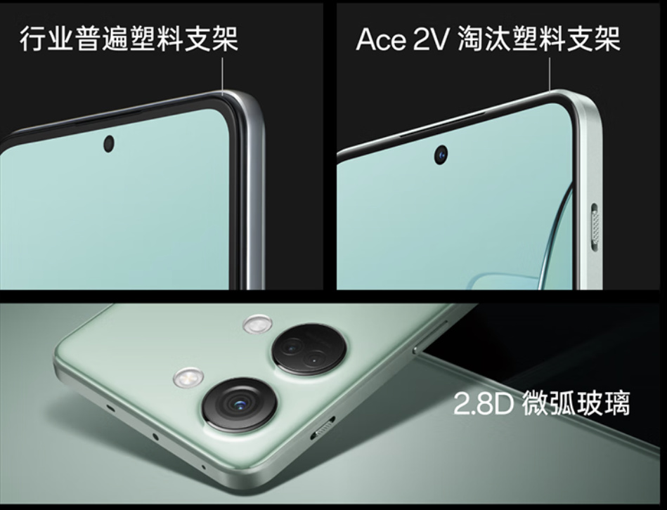 1.5K靈犀觸控屏幕支持1440Hz 高頻PWM調光,峯值亮度可以達到1450nit,120Hz刷新率、720Hz觸控採樣率、10.7億色顯示,通過南德精準觸控S級認證。一加Ace2V取消了塑料支架,8.15mm厚度,後蓋爲旗艦機最常用的絲綢玻璃,整機質感在這個價位絕對是排在前列的。