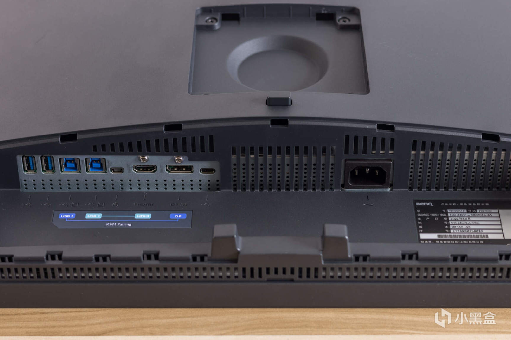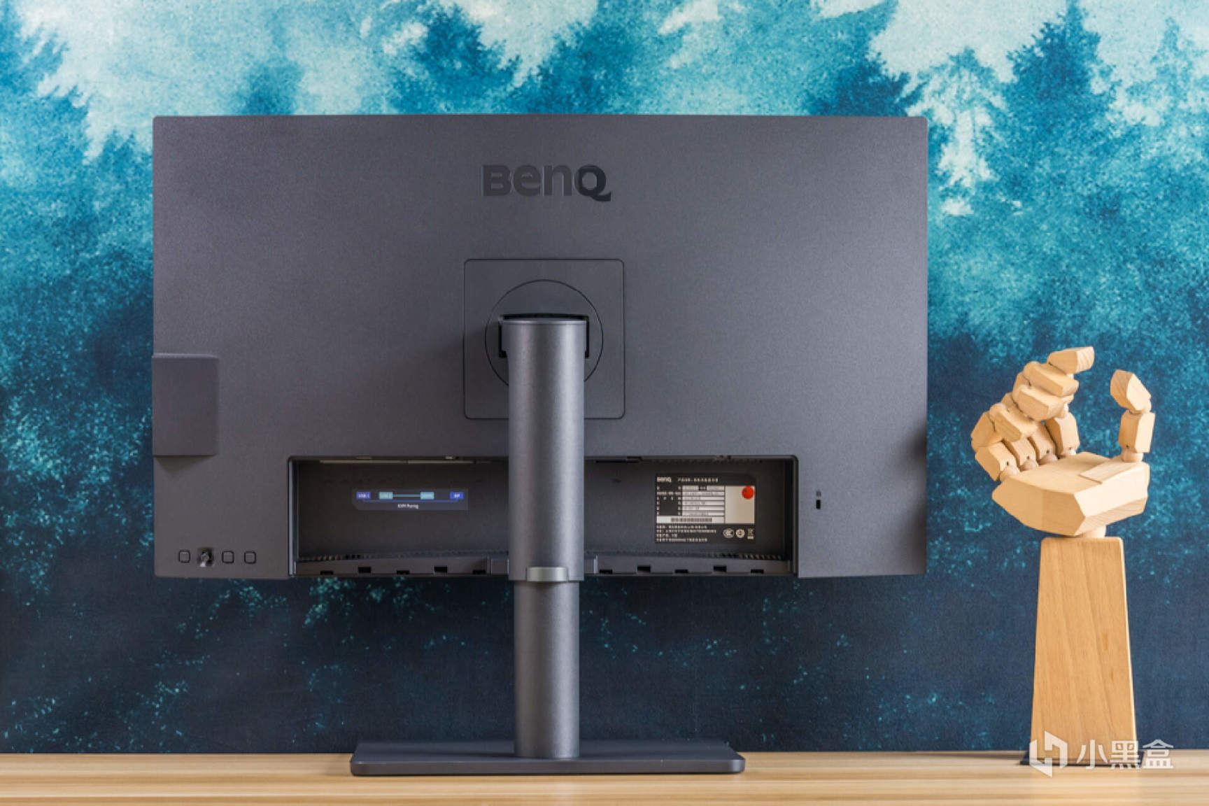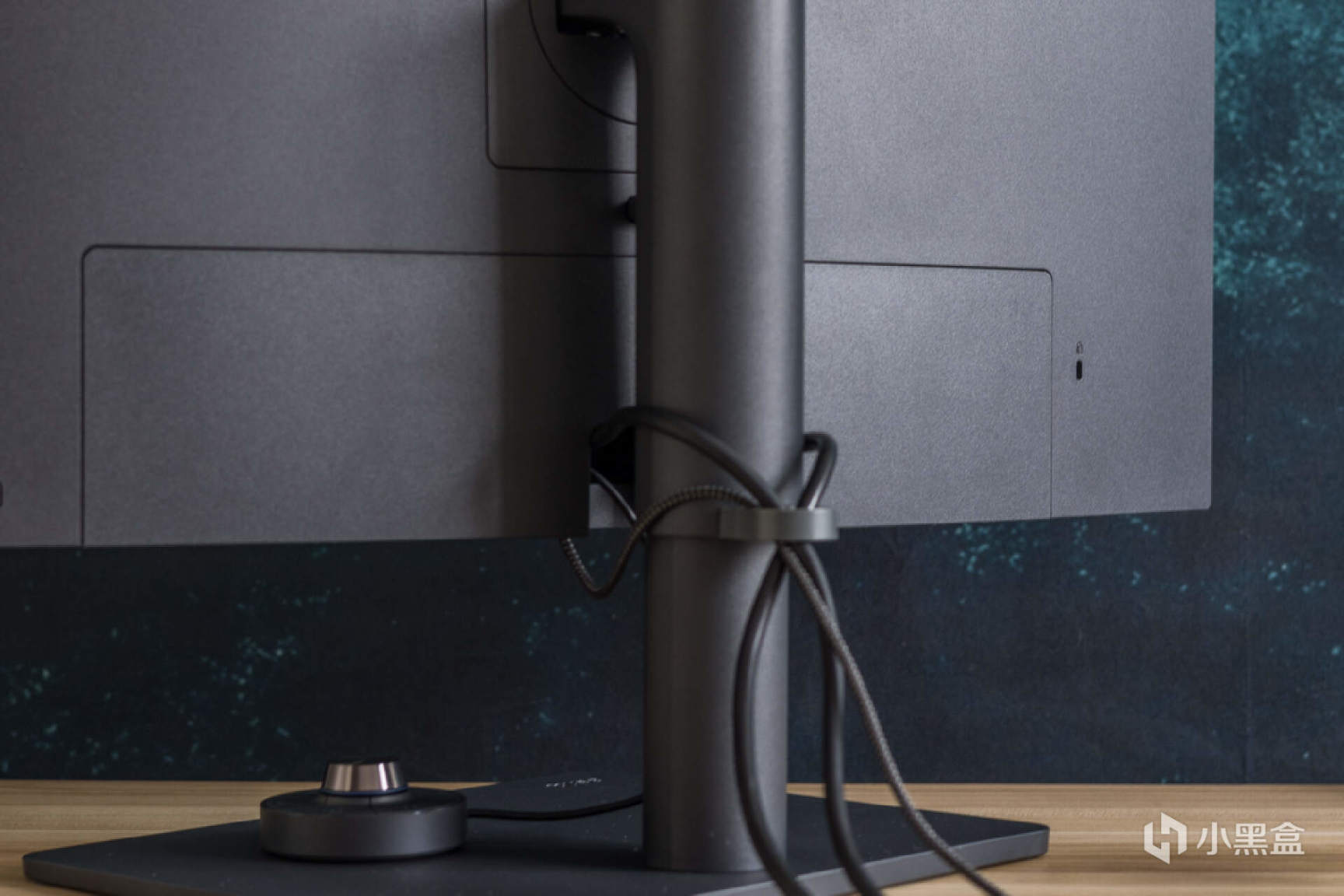 背面的殼體採用了灰色的磨砂塑料,除了亮面質感的BenQ字樣外也沒有其他多餘的裝飾。下方的長條形狀的凹槽是顯示器的接口區域,在接入線材後可以蓋上配件裏的收納後蓋,加上支架上的束線環,可以很好的整理接入的線材。