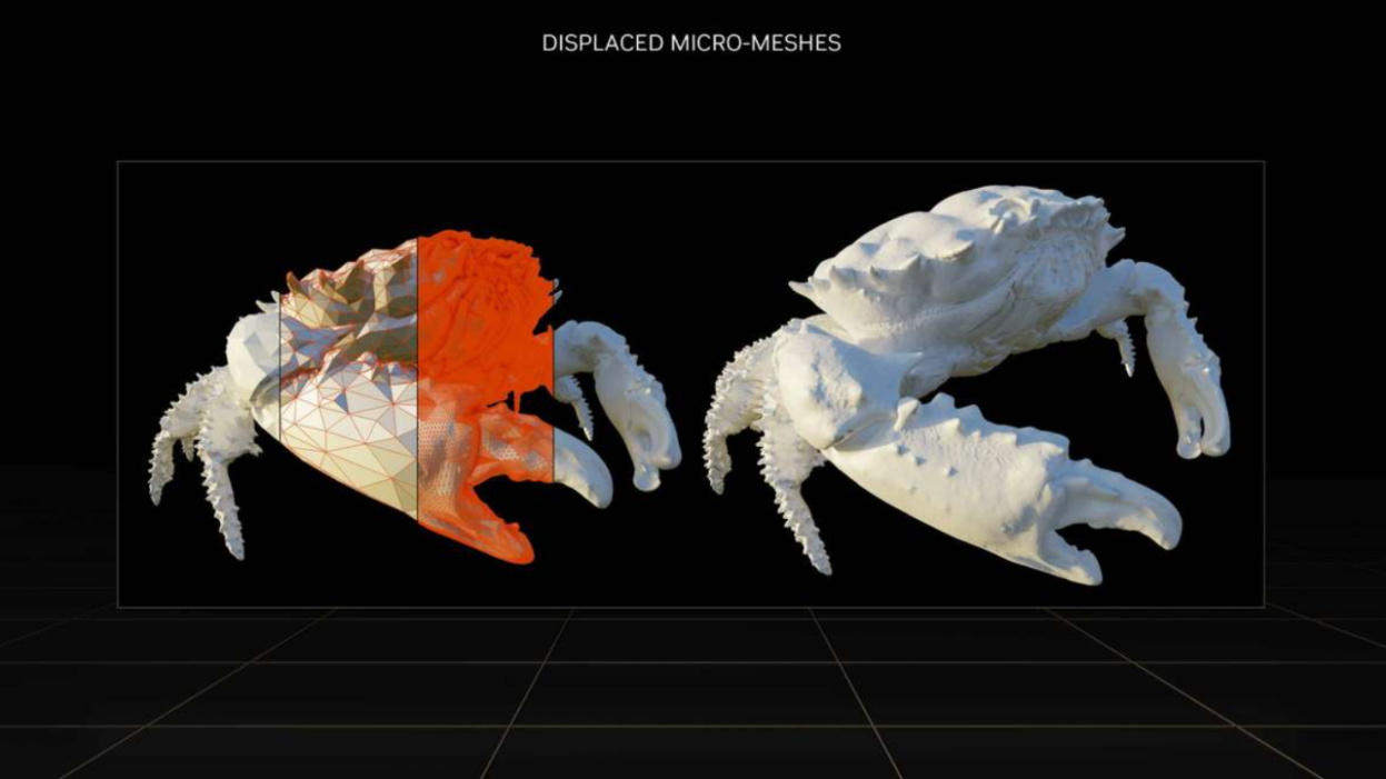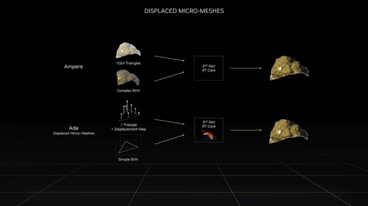 但是Ada Lovelace架构的处理方式就不一样,这个架构可以调用Displaced Micro-Mesh引擎一个简单的BVH然后加上不同的位移图来表达,直接缩短了BVH的构建时间,降低了BVH对储存空间的需求,在更低的计算资源下实现了更好的光线追踪渲染效果。