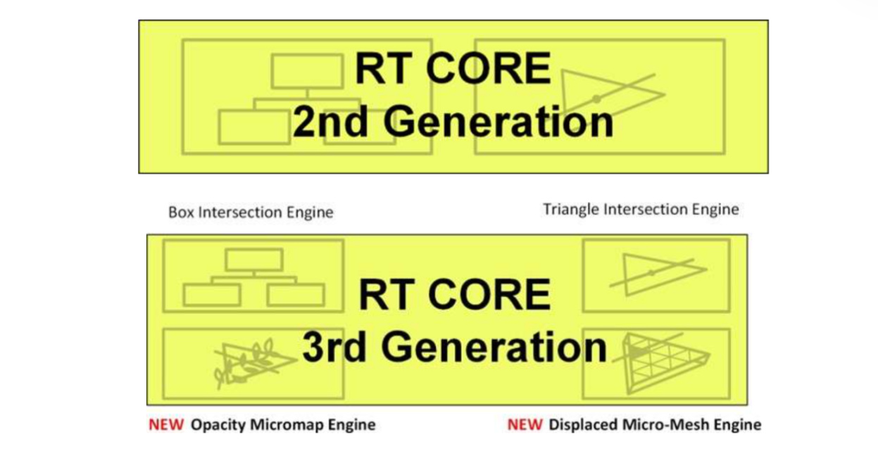整体来说,第三代RT Core的有效光追算力是第二代的3倍。主要是因为第三代的RT Core的光线与三角形求交性能提升了2倍起来了,并且额外加了Opacity Micro-Map引擎和Displaced Micro-Mesh引擎。