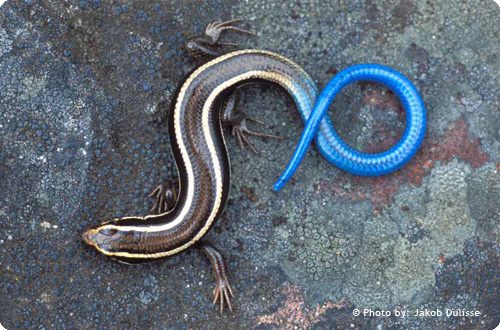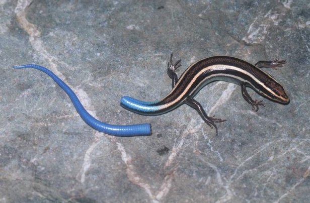 许多石龙子种类的幼体都有一条显眼的亮色尾巴,因为这样可以用来分散捕食者的注意力。如果被盯上了,它们可以把尾巴自动切断,从而让个体获得机会逃脱。