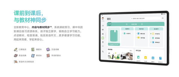 在體驗方面,華爲MatePad 2023內置全新教育中心,提供內容與教材同步的功能,包括系統課前預習、課中鞏固、點讀教材、漢語詞典、英語詞典和編程等功能。家長可以通過手機端教育中心App限定平板觀看時間和可訪問的應用,不用擔心孩子私自使用平板玩遊戲。