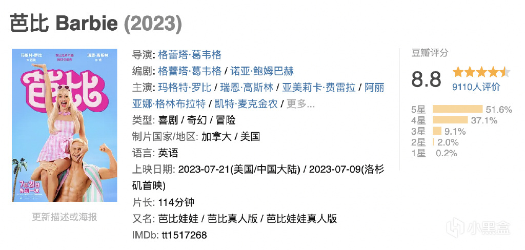 目前评分人数超过两万,8.8分也创造格蕾塔·葛韦格导演生涯新高,此前他最高分的两部电影,分别是19年的《小妇人》(评分8.0)与17年的《伯德小姐》(评分7.9)!