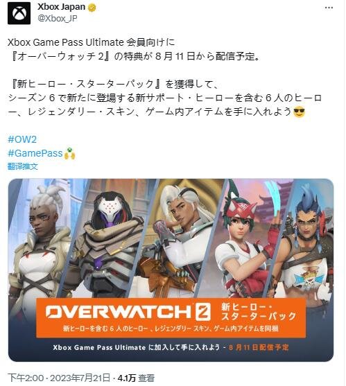 據Xbox日本官方推特消息,Xbox Game Pass Ultimate會員將於8月11日起可領取《守望先鋒2》的“新英雄入門包”。