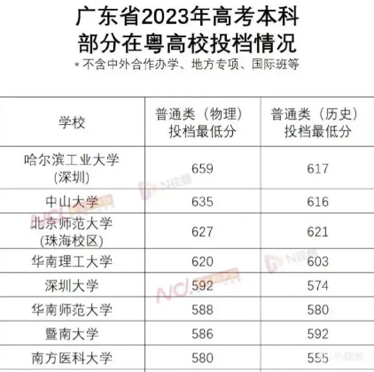 今年廣東省內23年高考本科部分在粵高校投檔情況,哈工深繼續表現強勁,整個榜單中,廣州大學成爲最尷尬的存在,普通類(物理)投檔最低分僅爲453分!