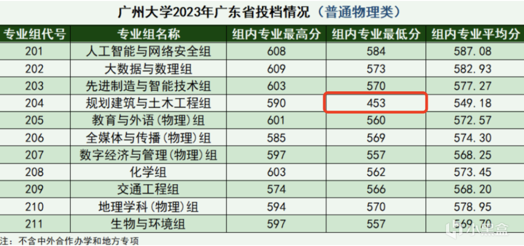 前天,廣州大學公開了“廣州大學 2023 年廣東省投檔情況”,在普通物理類中,土木類的最高分和最低分相差極大,該組最高分爲590分,最低分僅有453分!