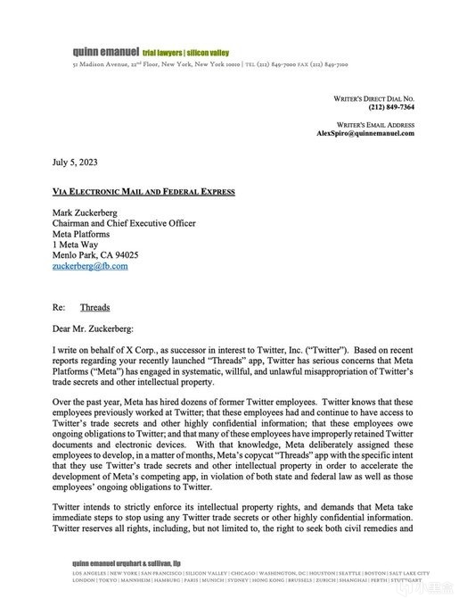 隨後,他立馬就讓律師給扎克伯格寄了一封律師函,理由是: