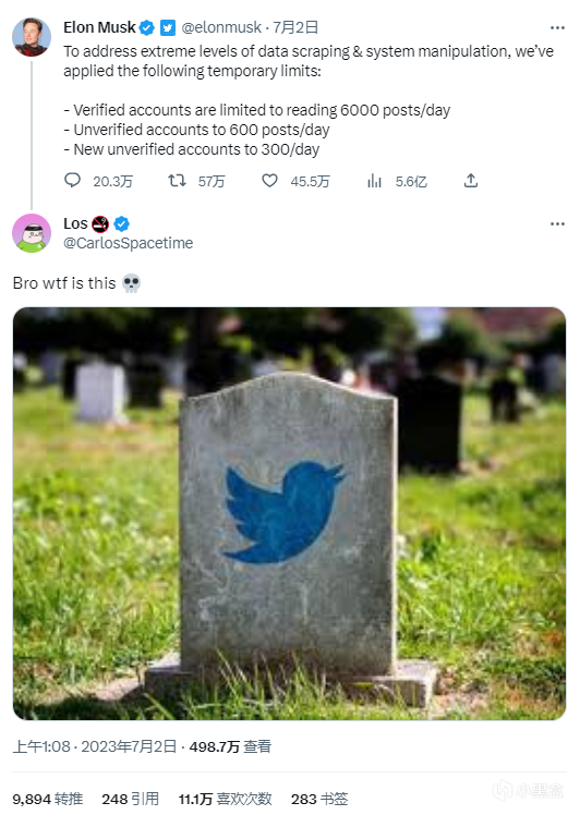 馬斯克發文表示,這是爲了應對推特被抓取數據和系統操縱的問題。推特暫時開啓了瀏覽限制,藍標賬戶每天能刷6000條推文,普通賬戶每天只能刷600條推文,新賬戶每天300條推文。