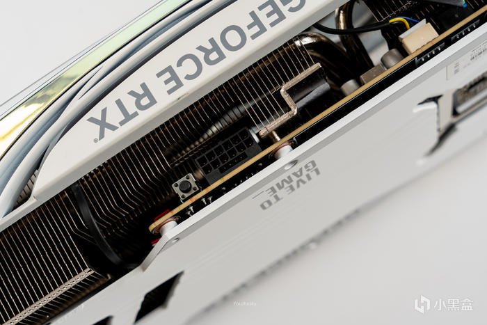 12VHPWR新型接口,中間還有一個雙BIOS切換開關,開關下面還有一個紅色接口可以接到主板上實現主板ARGB聯動