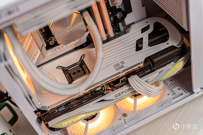 契合此次的白色主題的顯卡是索泰的4080 16GB AMP 月白,其採用了4080核心、高達9738個流處理器,128個第三代RT Cores,512個第四代Tensor Cores,並且用上了256bit位寬的16GB的GDDR6X顯存,具有450W功耗的12VHPWR新型接口。強大的顯卡性能配合索泰在4090上成熟的24+3相供電系統以及9熱管VC均熱板的超強IceStorm3.0散熱系統,讓整個顯卡發揮到性能極致。