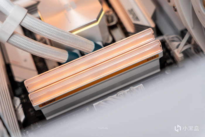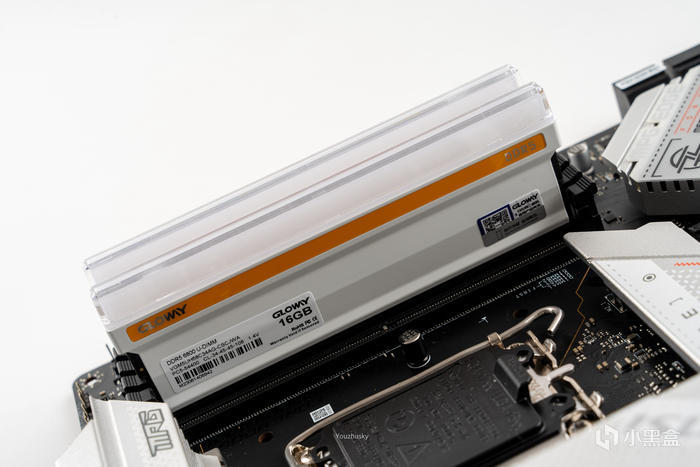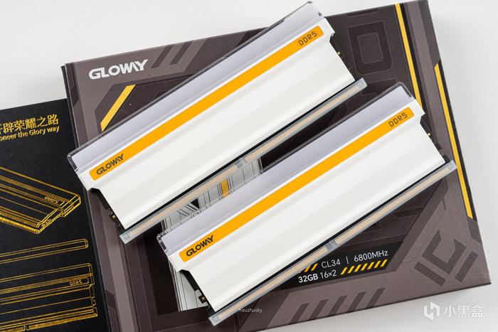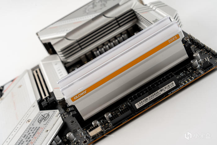 取出內存條,內存表面爲純白設計的鋁合金散熱片,上面一條橙黃色的色帶標註了GLOWAY的logo和DDR5的型號,而頂部爲RGB燈效並套以果凍質感的導光條