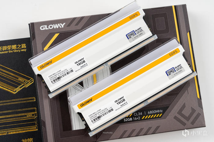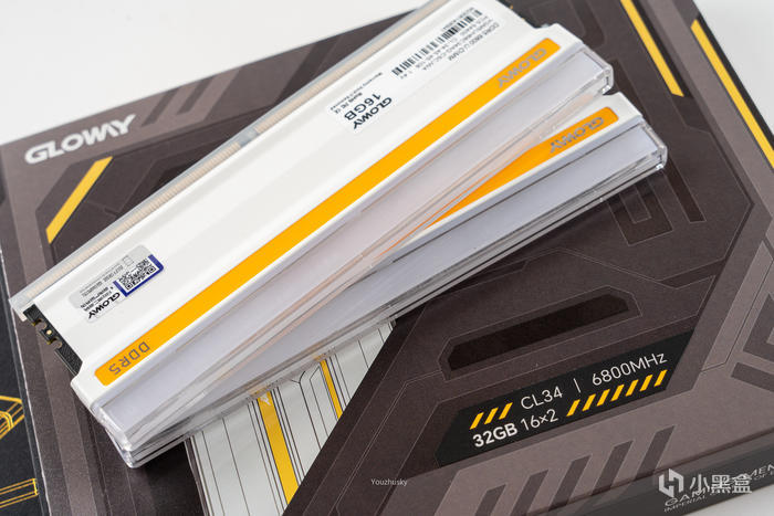 今年13代和ZEN4終於在今年成爲主流,那最大的功臣應該屬於DDR5內存終於降價成爲真正意義上的“買新不買舊”,而讓DDR5的性能突飛猛進的大功臣又屬於海力士的A-DIE顆粒的普及。當然最終推波助瀾的則是國產廠商的DDR5讓我們毫不猶豫的選擇,畢竟性價比真的太高了。這次白色主題上選擇的是國產品牌光威最新推出的神策燈條皓月白顏色,包裝是彰顯科技感的黑灰配色,左上角爲品牌標註GLOWAY的logo,橙色拉絲條表面內存爲帶橙色款,右邊顯示其爲DDR5,中下有標註了其32GB 16X2規格,以及CL34 6800MHz的時序和頻率