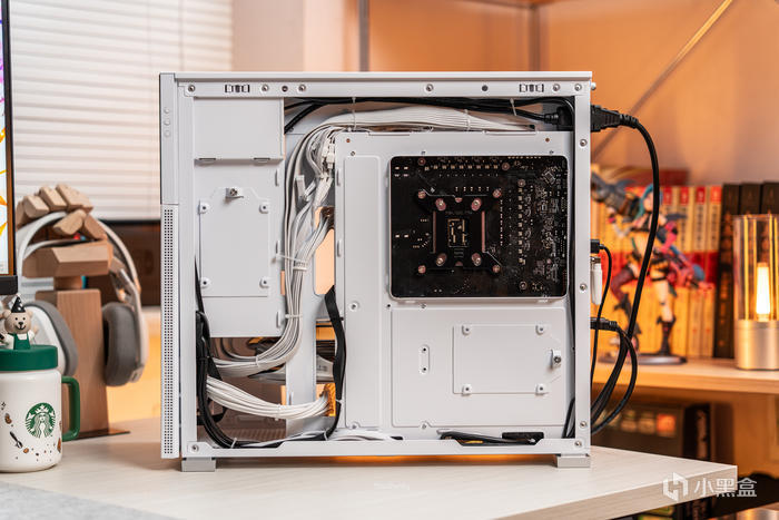 打開背板看內部的理線,兩個走線槽正好可以適配前置電源的線纜,小空間也能滿足較多的理線線纜