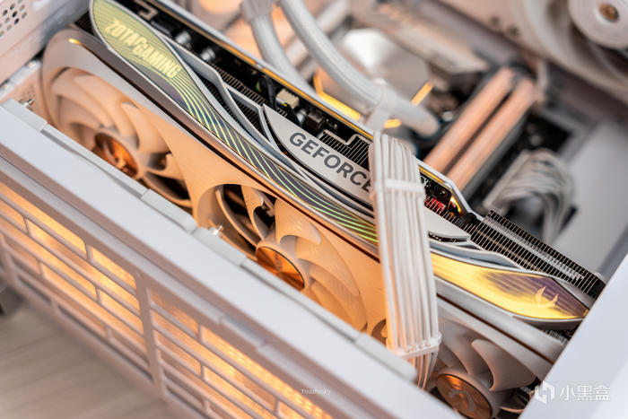 白色主題的顯卡選擇了索泰的4080 16GB AMP月白顯卡,這是索泰在40系顯卡上緊跟潮流推出的白色款,顛覆黑色AMP變成了純粹的白但仍繼承AMP系列強悍的配置,包括了24+3相的SEP供電系統,以及9根冰脈複合熱管和VC均熱板的IceStorm3.0散熱系統。4080 16GB AMP月白顯卡高達9738個流處理器,128個第三代RT Cores,512個第四代Tensor Cores,並且用上了256bit位寬的16GB的GDDR6X顯存,具有450W功耗的12VHPWR新型接口