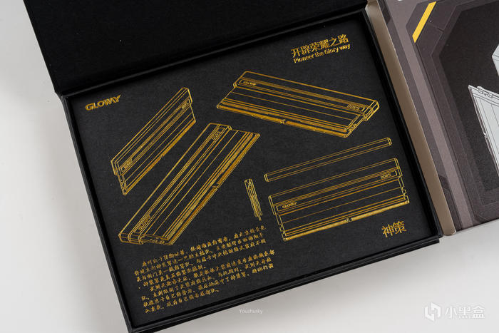打開包裝是一雙絲質手套,在取用內存時可保護這款神策內存頂部的果凍質感的冰晶發光條,取出手套之後是神策內存的設計稿,以及型號的由來靈感爲唐太宗的神策軍