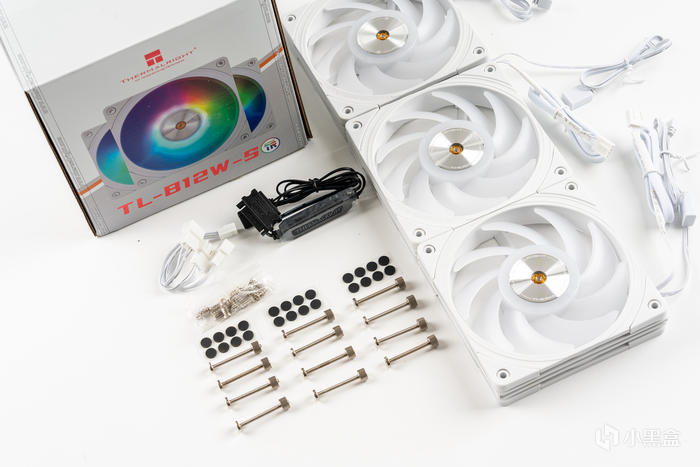 兩把無光性能典範TL-B12W風扇,採用動平衡點膠2.0工藝實現三軸動平衡矯正,並使用了鐵殼鋼芯軸套的S-FDB V2,2150RPM下可實現最大風量69CFM、風壓2.87mmH2O