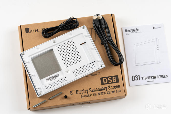 配件盒內的8寸副屏,採用了1.1mm厚度/6H硬度的鋼化玻璃與LCD全貼合保護,1280x800分辨率,配置的線纜爲TYPE-C供電線與miniHDMI線,用於供電和連接顯卡