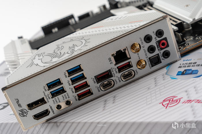 一體式的IO護盾提供了豐富的後置接口,從左至右依次爲集顯DP/HDMI接口、CLEAR CMOS/FLASH BIOS按鈕、4個USB3.2 gen1 5Gbps、4個USB3.2 GEN2 10Gbps、1個10Gbps TYPE-C、1個20Gbps TYPE-C、WIFI6E雙天線接口、音頻光纖及輸入輸出接口