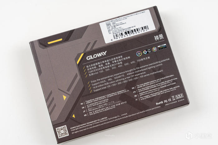 包裝背面標註了型號爲神策和超頻潛力,以及支持華碩、微星、華擎主板燈效控制,並使用多國語言標註了保修政策
