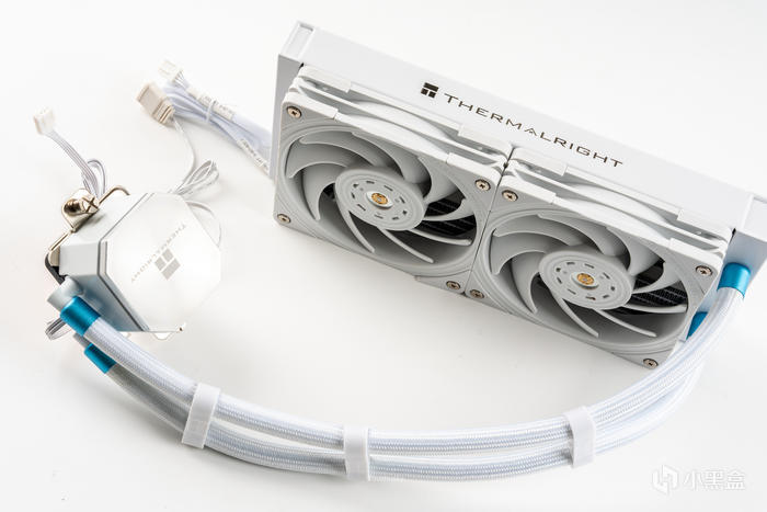 水冷的本體,通體白色設計,頂蓋全鋁合金,冷排和風扇也是純白,水冷管和管夾也都是白色的