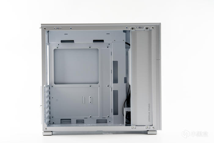 機箱內部大開孔的ATX安裝位,頂部和右邊的過線孔都有朝主板側凹陷設計,便於背線走線;而電源位前置那線纜肯定裸露在下面,所以右側有一遮線擋板,右下角有JONSPLUS STUDIO的logo;不僅支持360水冷,還可兼容168mm的高塔散熱