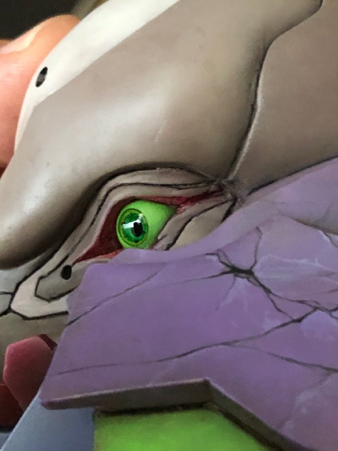 去掉初號機頭部的外甲,我們可以看到類似於生物的頭部內構,看眼部周圍的細節,完全是生物體才擁有的,綠色的眼睛和眼部的肌肉好像隨時都在顫動。大家感覺恐怖還是可愛呢?