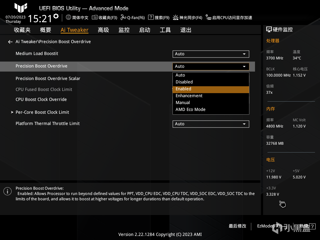先把TUF GAMING A620M的BIOS版本刷到最新,这款主板供电不错,所以自然也支持PBO技术,测试全程会把PBO设置到Enaled状态,符合大多数用户的使用习惯,除此之外主板还可以设置AMD ECO(PPT、EDC、TDC已经预设好)、Enhancement等模式,主板并不能手动设置核心频率,但也可以通过Enhancement模式提升性能降低温度,后续有时间再细说。