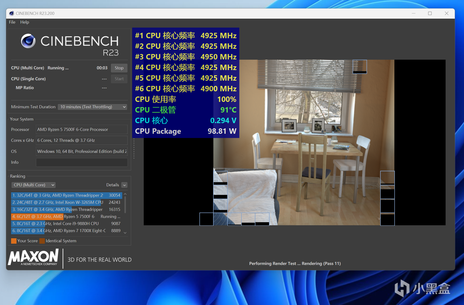 CINEBENCH R23十分钟多核循环项目,锐龙5 7500F核心频率浮动在4.9GHz左右,CPU二极管温度为91℃,CPU Package功耗98W