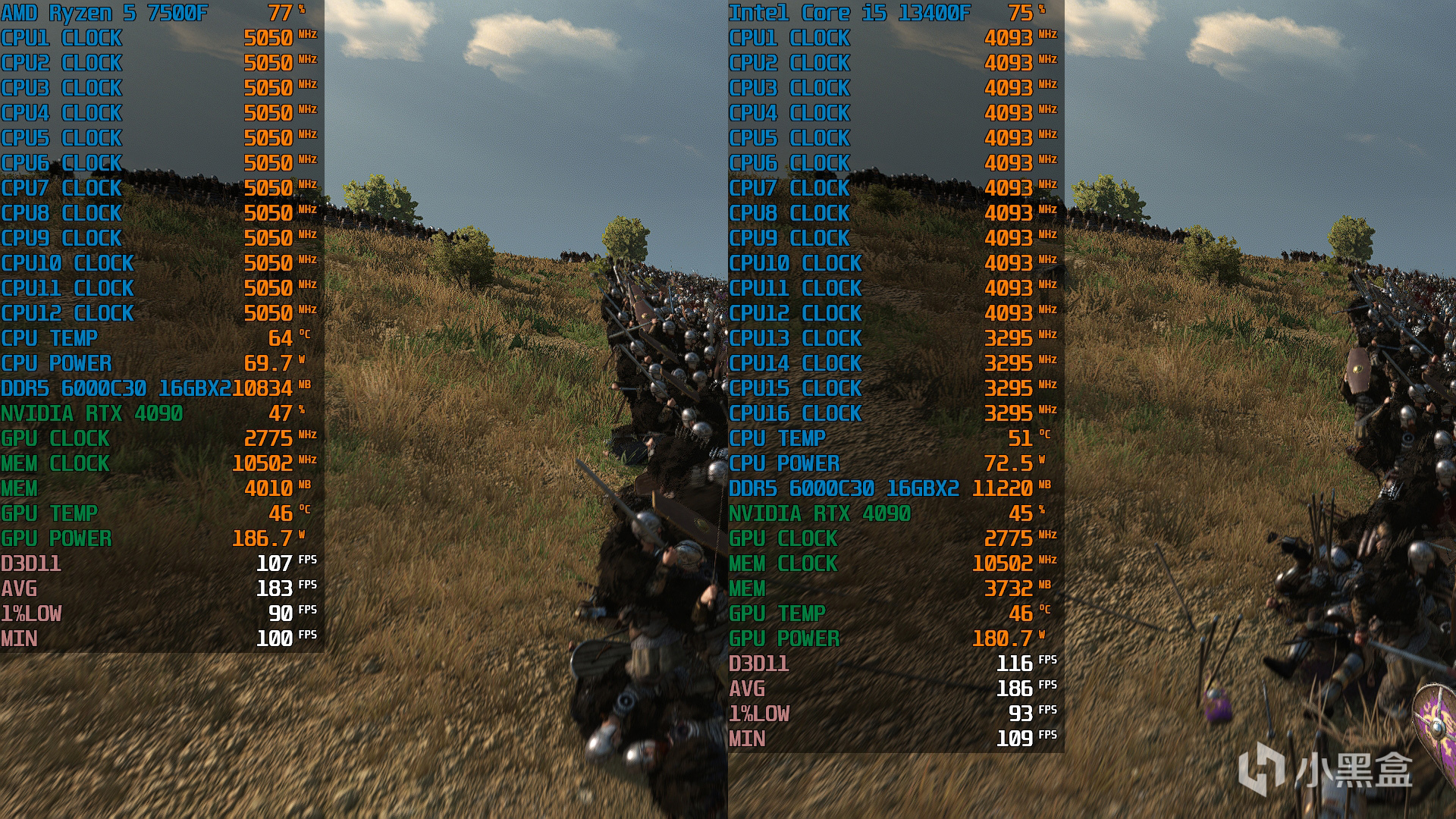 锐龙5 7500F和酷睿i5 13400F在《骑马与砍杀2》中的硬件OSD信息
