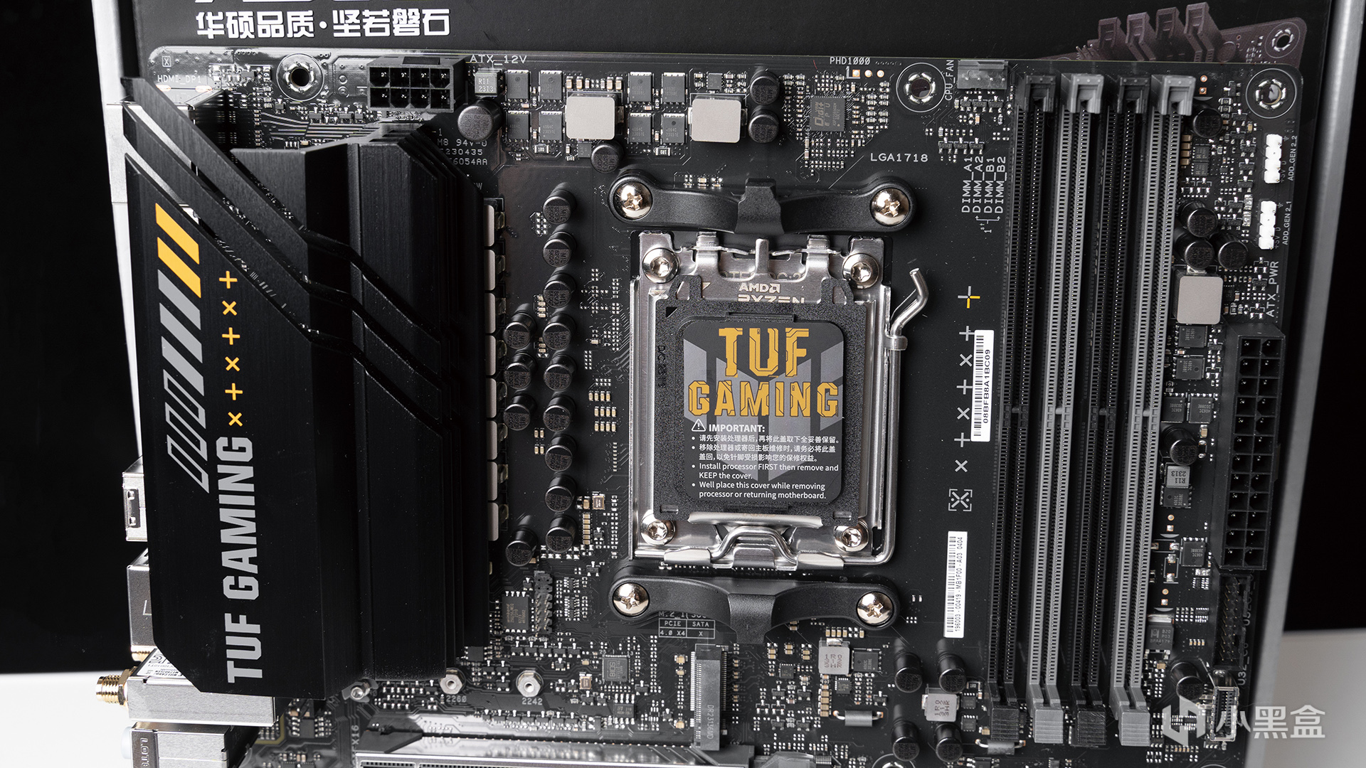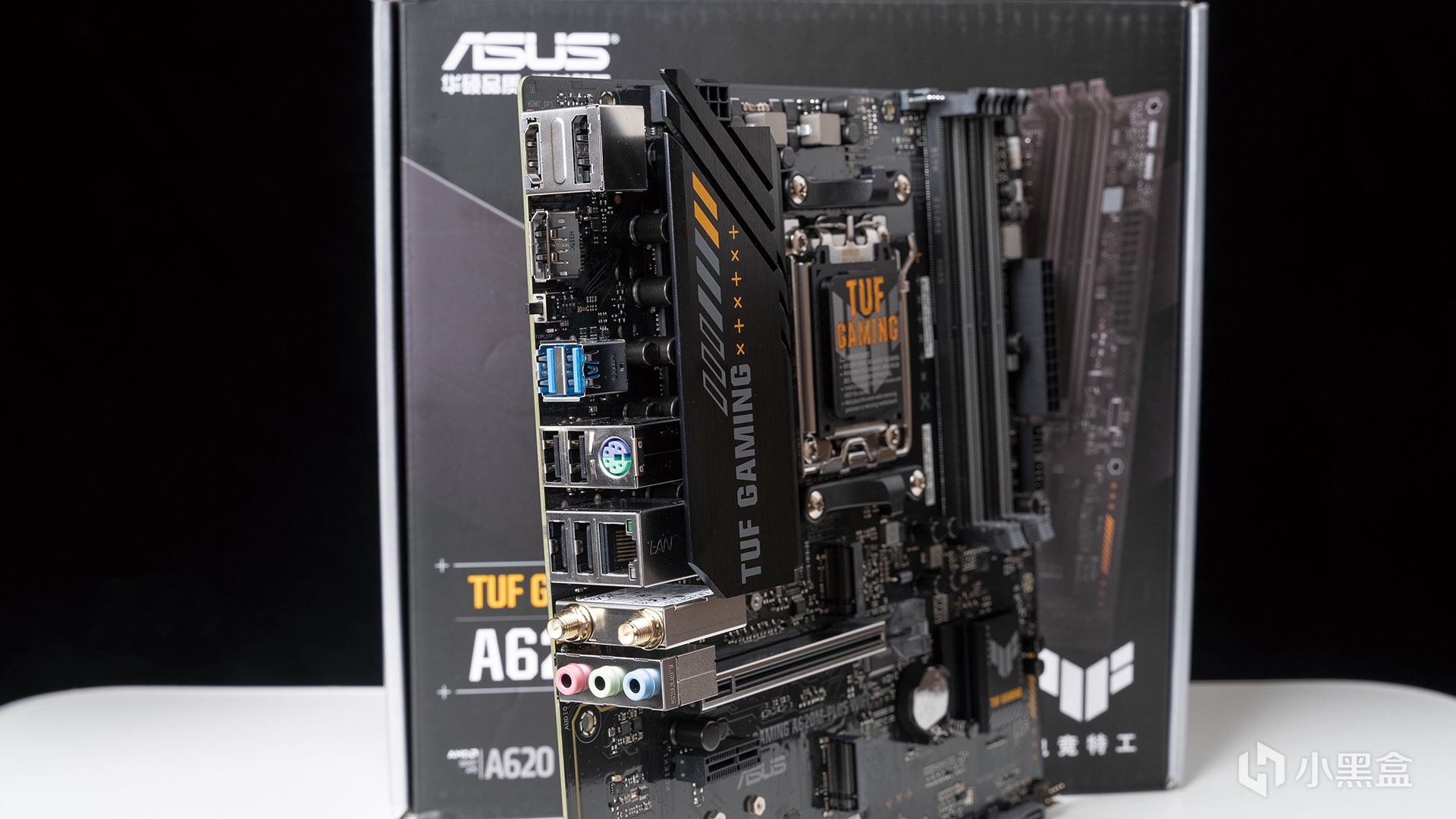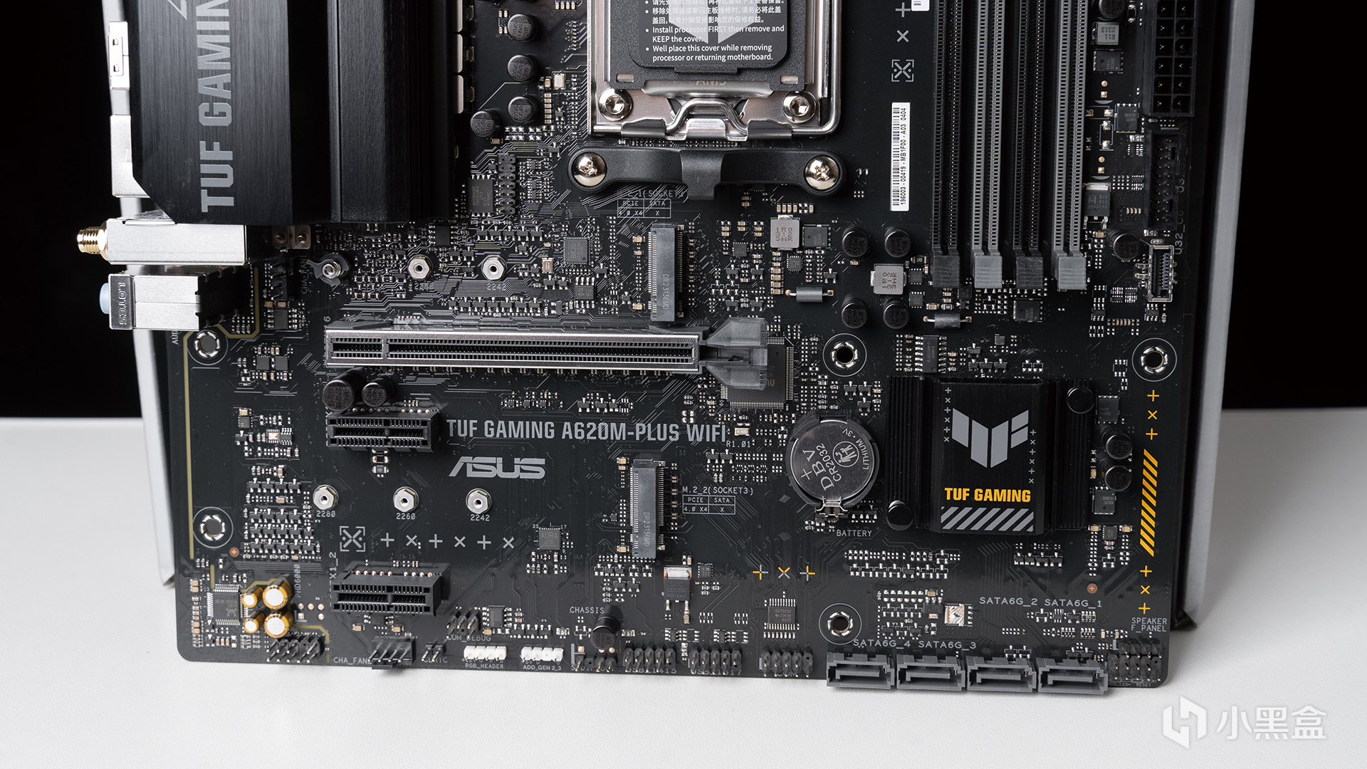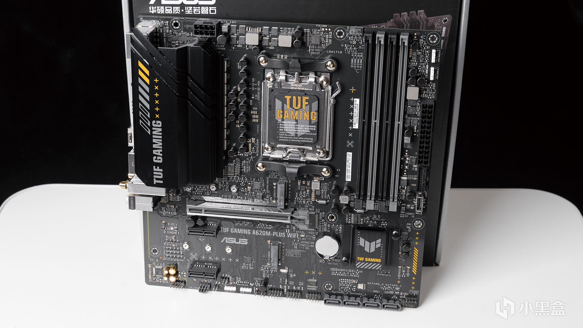 平台来自华硕TUF GAMING A620M-PLUS WIFI主板,标准M-ATX板型,外观设计其实更偏向上一代B550重炮手——采用经典TUF GAMING风格+点缀式的黄色区域,A620定位要低于B650,但就这块板子规格设计而言,它是可以完全胜任锐龙7000家族全新CPU的。