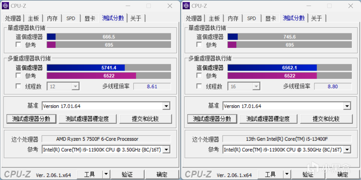 最常见的CPU-Z理论跑分,多核分数由于两者总核心数并不一样,酷睿i5 13400F要略胜一些,单核方面也要更高。单论锐龙5 7500F的分数,和同门的锐龙5 7600对比,其实多核基本是没变化的,单核则是弱一些。