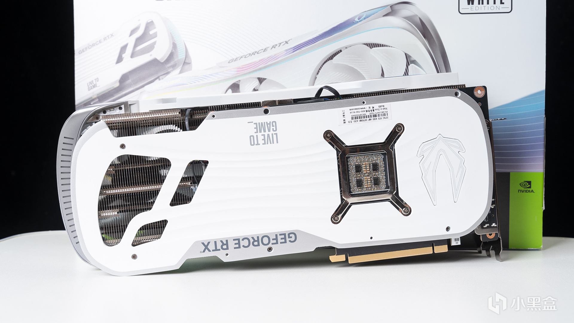 背面有厚实的金属背板加装,也是属于充分圆润化的设计,同时有一些不规则的曲线作为修饰。当然,背板的AMP LOGO和尾部线状排列也是支持ARGB灯效的。除此之外,GPU核心部分拥有金属固定支架加固,以便增强显卡整体强度。