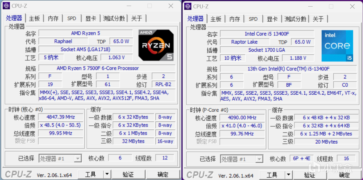 锐龙5 7500F和酷睿i5 13400F的CPU-Z参数一览,目前版本还不能完全正确识别锐龙5 7500F,在核心规模上,酷睿i5 13400F会多出来四个小核心,理论多核性能更强,酷睿i5 13400F大核固定睿频4.1GHz+小核3.3GHz,而锐龙5 7500F在待机状态下也能看到核心时常会睿频至无限接近5.0GHz,三级缓存也更大。