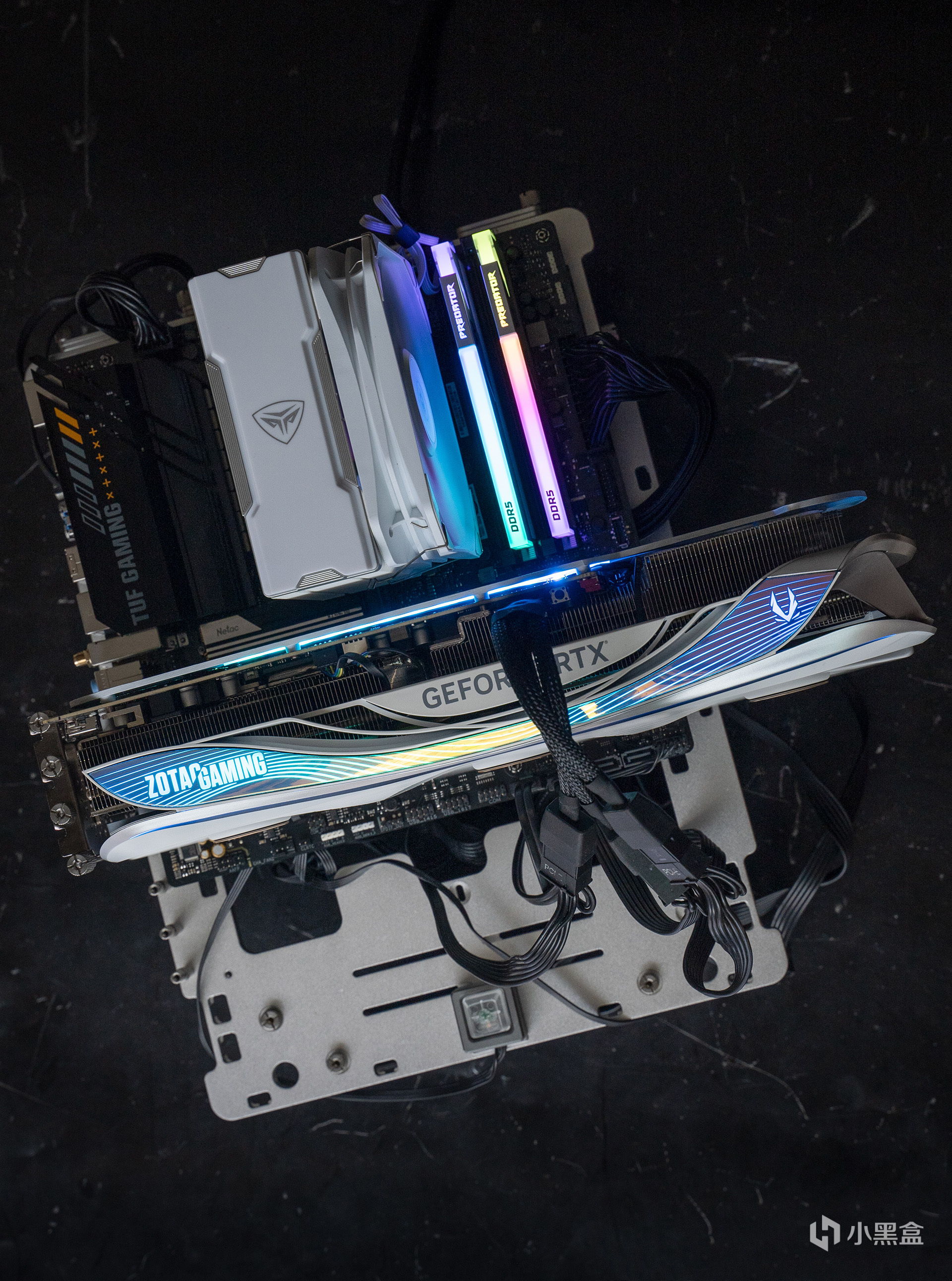 锐龙5 7500F的整机测试平台,本次还是采用裸机形式测试,通电效果还不错,只有内存和显卡有ARGB灯光。
