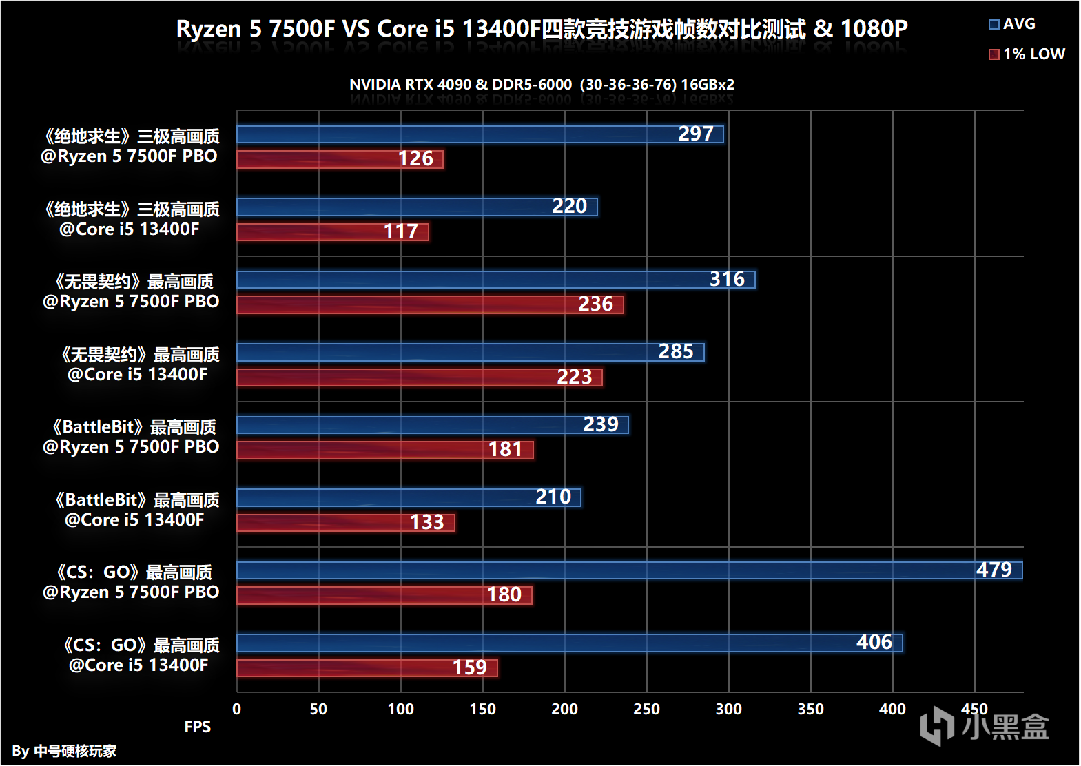 就以上十一款游戏成绩平均下来,锐龙5 7500F可以领先酷睿i5 13400F达到11%左右,具体到竞技游戏方面,像热门的《绝地求生》领先幅度达到35%之多,即便i5 13400F搭配延迟更低的DDR4高频内存,这巨大差距根本是无力回天之势,其他三款竞技游戏差距也达到了10%~20%之间。