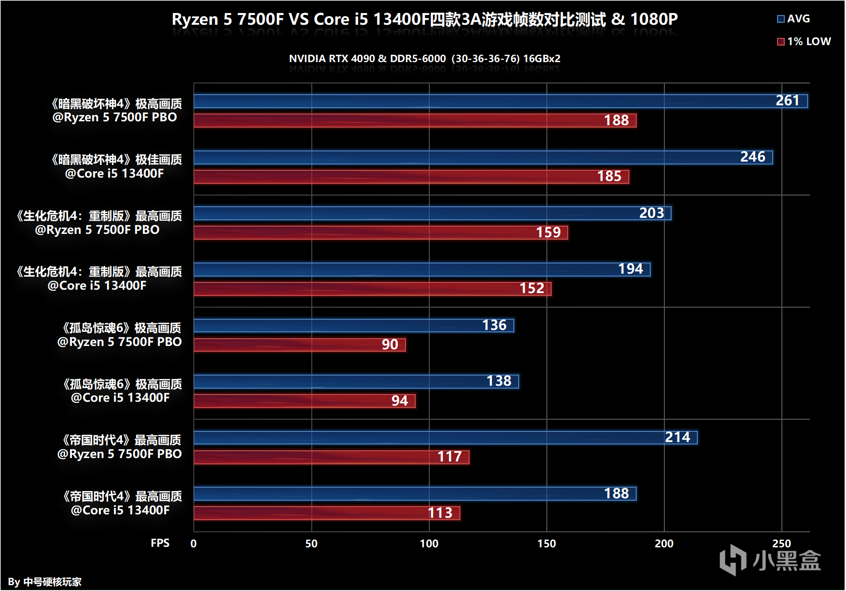 游戏方面,本次选取了一共十一款游戏,其中有四款属于竞技类游戏,也就是会更在意平均帧和1%LOW帧,其他游戏属于3A级,也有今年的两款重量级新作《生化危机4:重制版》和《暗黑破环神4》,为了充分体现CPU之间的最大性能差异,因此都是在1080P分辨率下测试,游戏画质设定和测试方法都标注在数据图表区域。