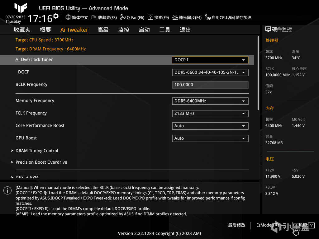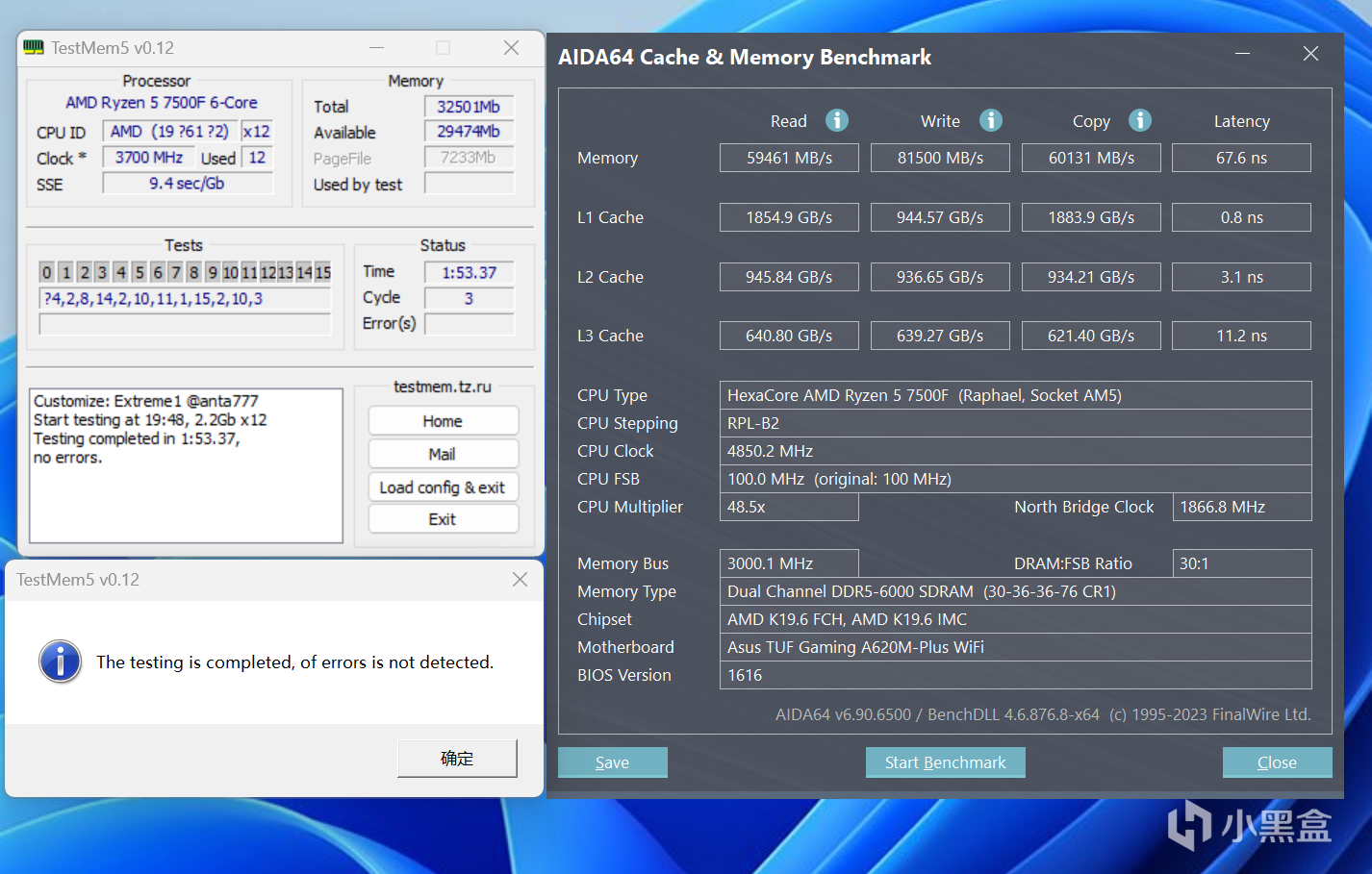 其二这款主板是能进行内存超频的,锐龙7000在同频情况下通常最多能超到DDR5-6400Mhz,不过得看CPU体质好坏。本次就以锐龙7000甜点频率进行测试吧,开启XMP后时序会调节至DDR5-6000C30-36-36-76,属于比较主流的参数设定。