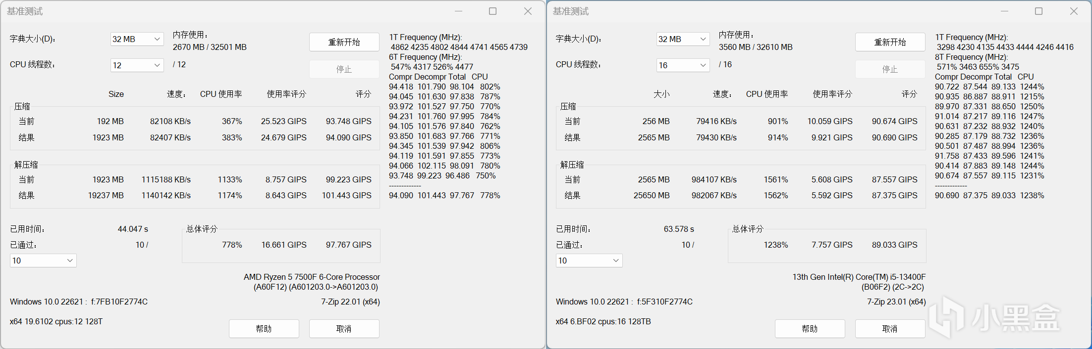 7-ZIP压缩和解压缩,锐龙5 7500F压缩速度为82407 KB/s,解压缩为1140142 KB/s