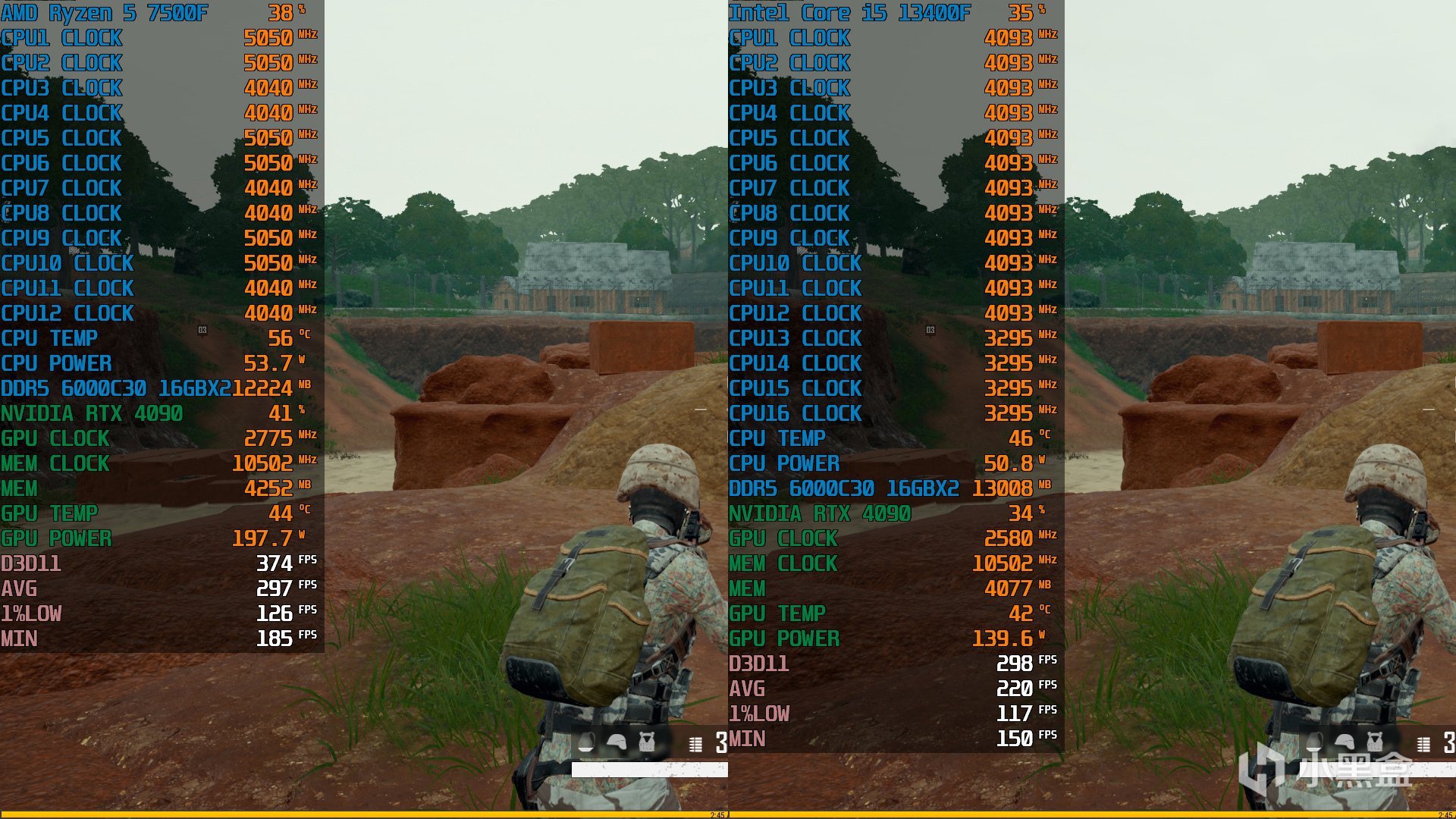锐龙5 7500F和酷睿i5 13400F在《绝地求生》中的硬件OSD信息