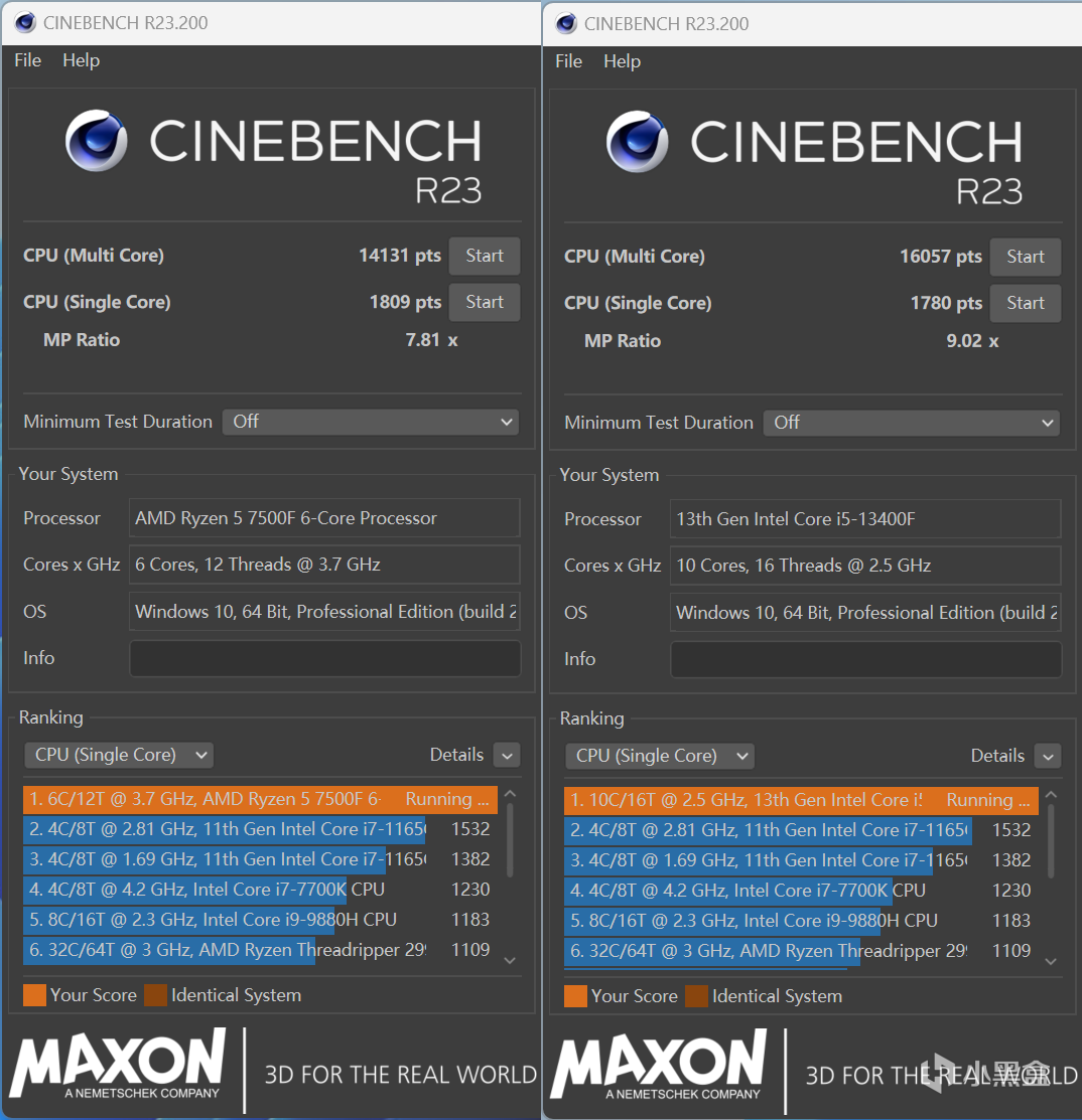 CINEBENCH R23分数,锐龙5 7500F单核分数1809 pts,多核分数14131 pts