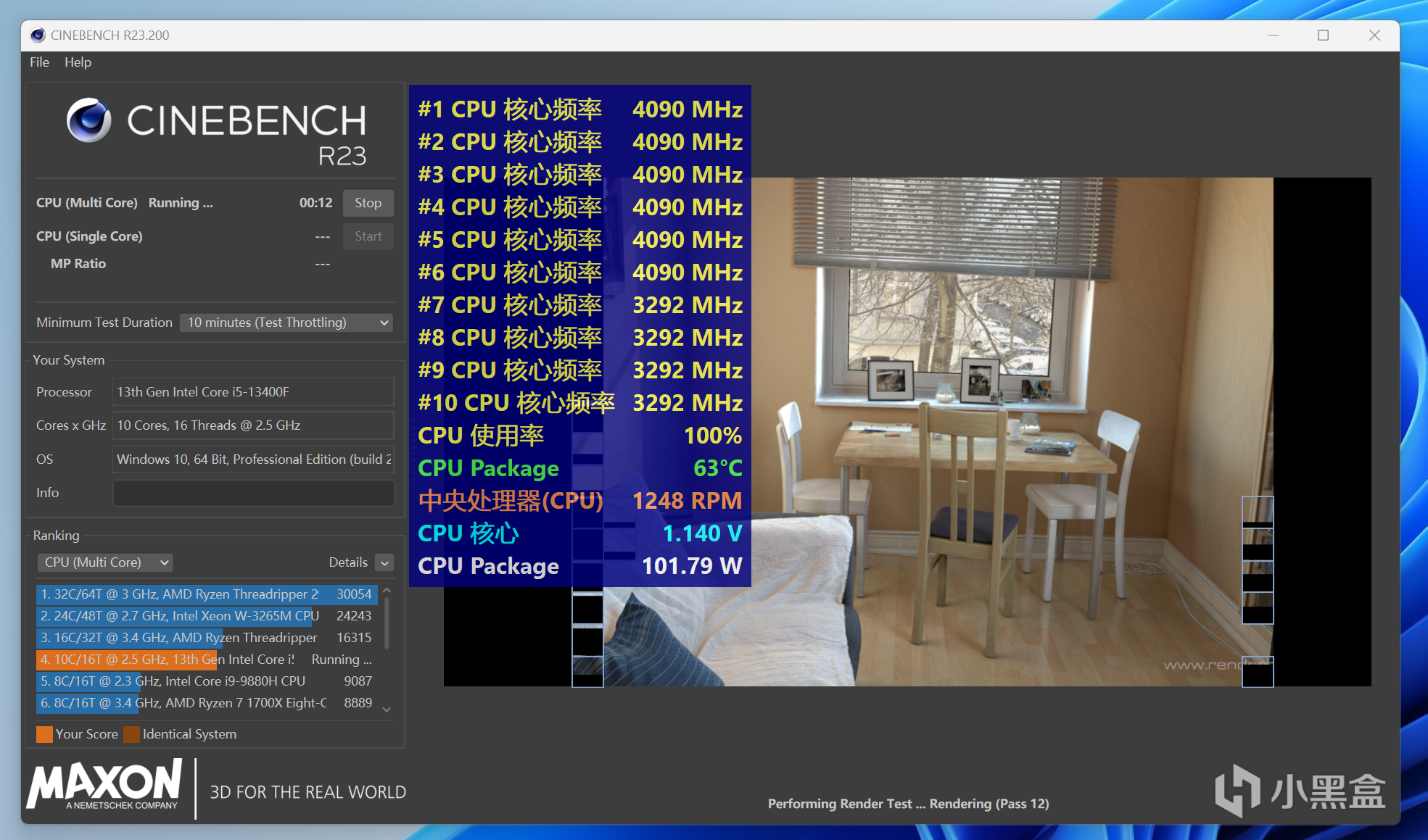 CINEBENCH R23十分钟多核循环项目,酷睿i5 13400F核心频率稳定大核4.1GHz+小核3.3GHz,CPU Package温度为63℃,CPU Package功耗101W