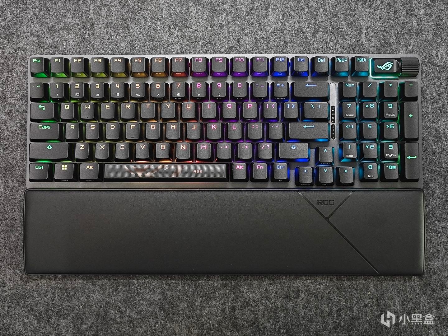 配件上,除了以上提及的增补空格和常规的充电线,ROG 还提供了接收器转化器和配套的磁吸手托,前者可以尽可能缩减接收器和键盘的距离,后者则适合喜欢低按键高度的朋友使用,不过手托正面为 PU 材质,夏天使用会比较闷。