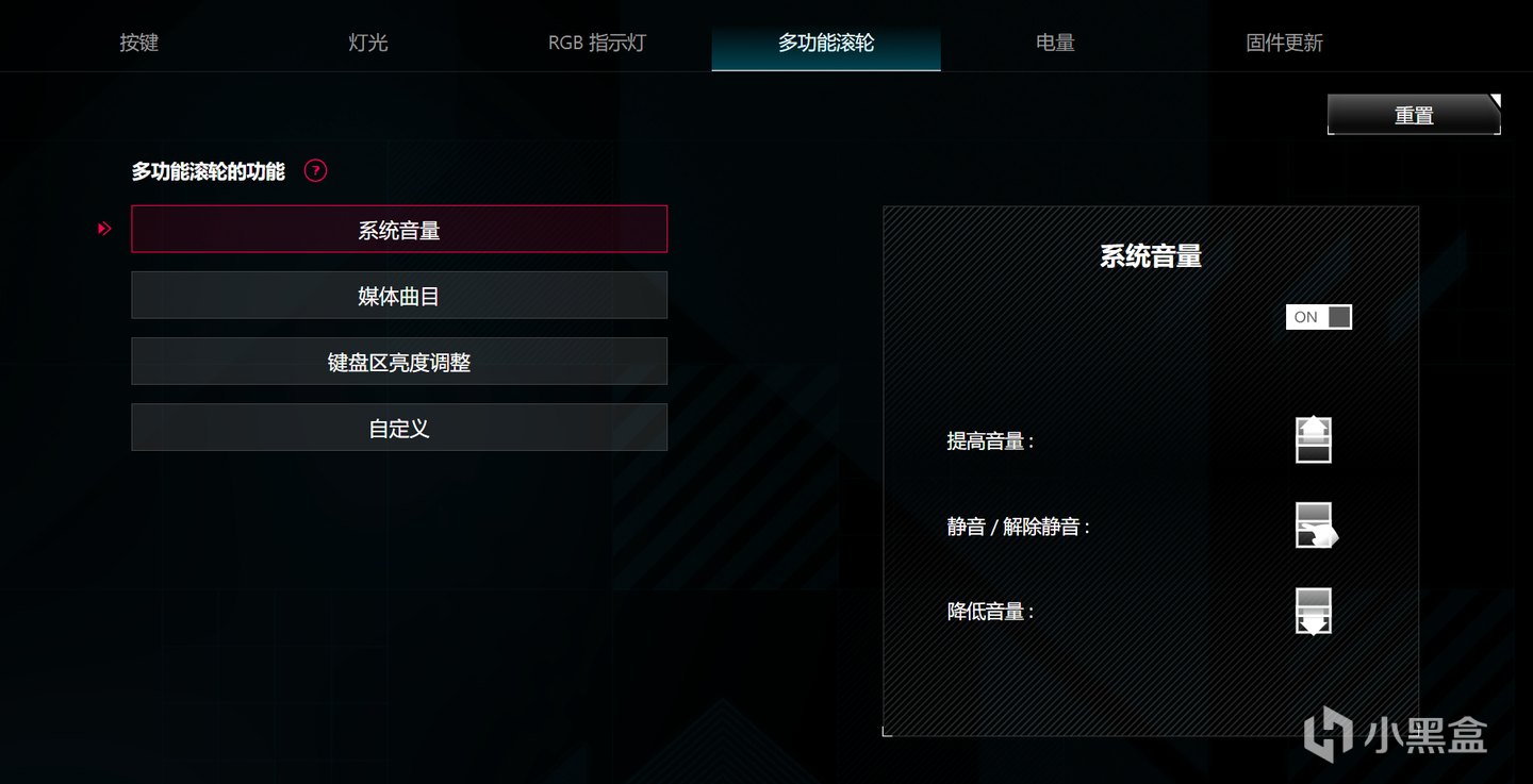 其中多功能滚轮算是游侠 2 的一大卖点了,其默认为音量模式,向上/向下滚动为增大/降低电脑音量,按下便可一键静音,而通过功能切换按键可以把滚轮切换为不同功能,例如多媒体模式中滚轮上下滚动为切换电脑歌曲、背光模式中滚轮上下滚动为调节键盘背光亮度等等,还可以自定义,操作逻辑简单易懂,非常好用。