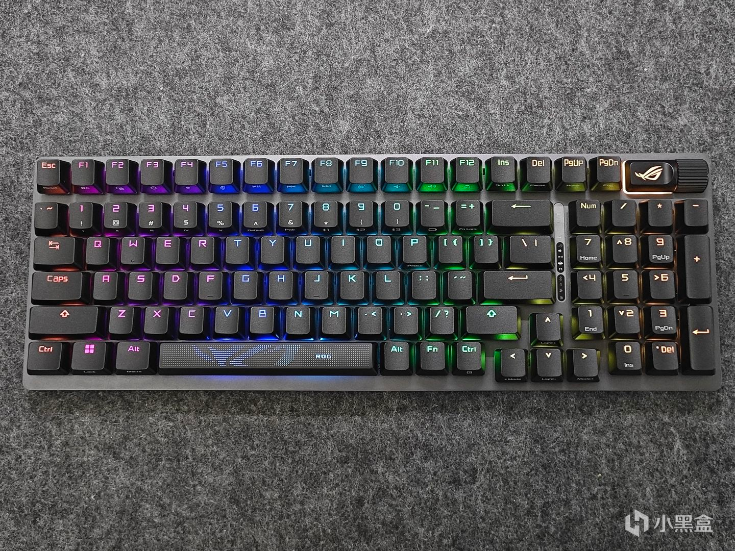 不过鱼与熊掌不可兼得,厂家都得对键盘的 Ins、Del 等功能键进行取舍才能缩减为 98 配列的尺寸,而且由于有 98 配列外观专利的存在,不同 98 配列键盘的设计方案有所不同。游侠 2 的方案是把 F 区连贯起来,然后把尽可能多的功能键(Ins、Del、PgUp、PgDn)排在 F 区之后,在右上区域再设计一个多功能滚轮和一个带 ROG 信仰之眼的功能切换按键。