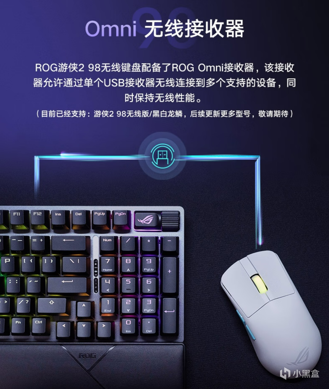 而且 ROG 给游侠 2 配套了新的 Omni 接收器,其支持同时连接多个 ROG 外设,如果手上有龙鳞的已经可以与游侠 2 共用一个接收器,对于 USB 接口紧缺的笔记本用户可谓一大利好。