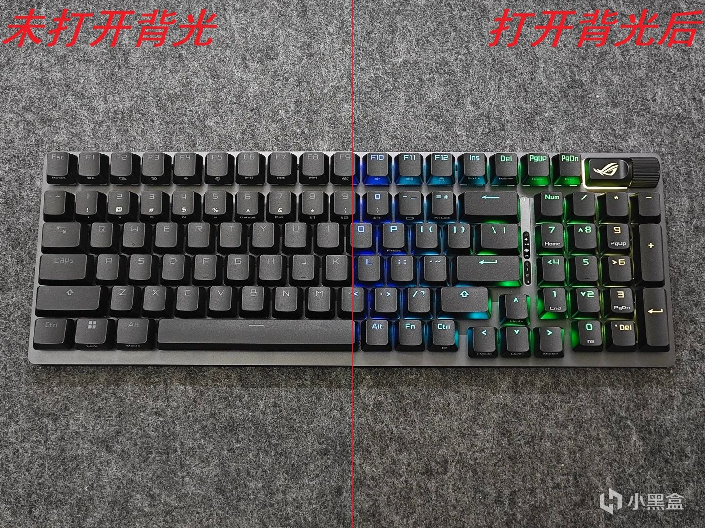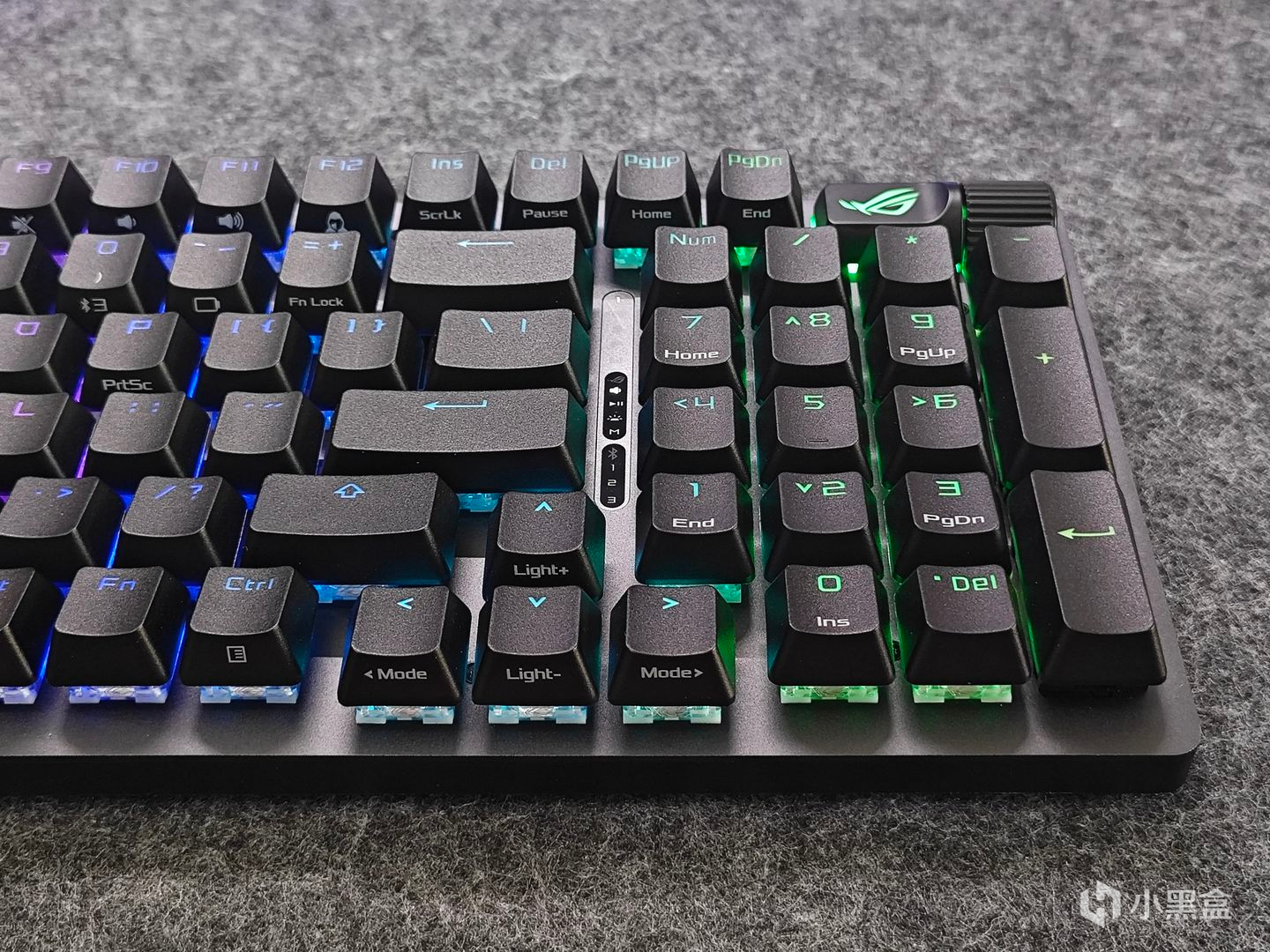 不过如此设计使得游侠 2 的 F 区按键非常紧凑,基本无法盲敲,而且功能键特殊的位置需要一定学习成本,观感上也难言美观,只能说在功能性和美观便用性之间 ROG 选择了前者。