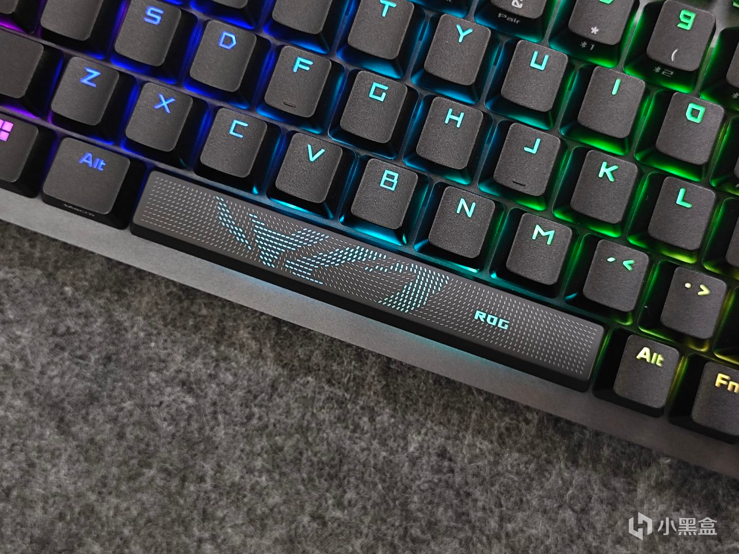 值得一提的是,游侠 2 还附赠有一个透光的增补空格,得益于空格下方设计了 3 颗 RGB 灯珠,换上后打开背光那一刹那空格上会惊现出大大的 ROG 信仰之眼,堪称为键盘注入灵魂,相当酷炫。