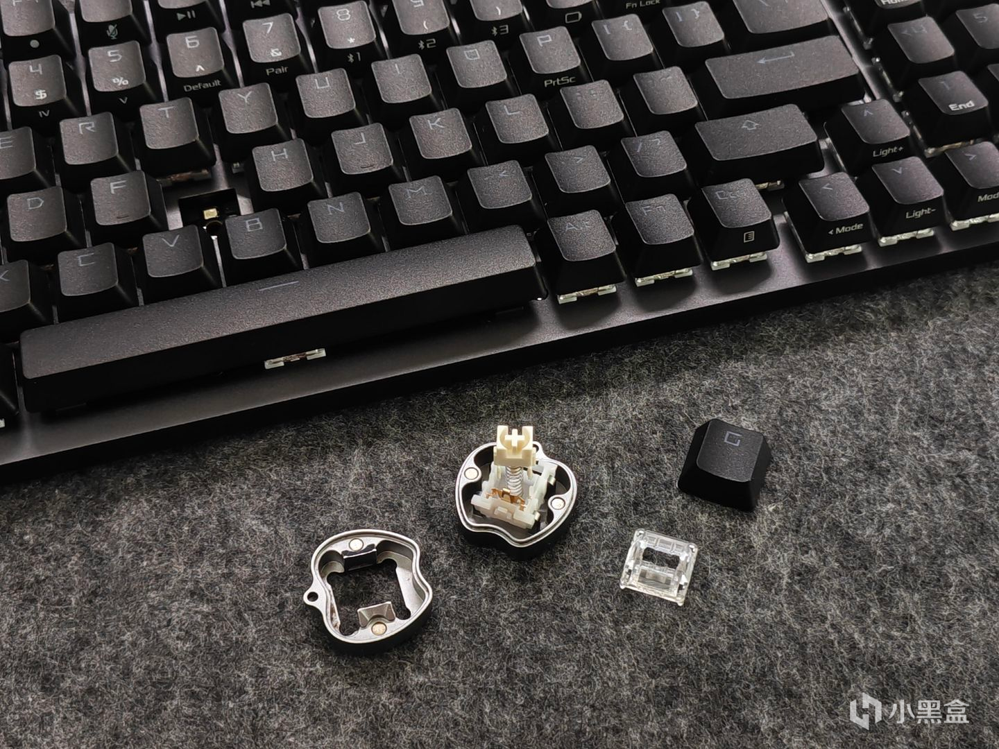 游侠 2 搭载的是 ROG 全新自研的 NX 雪武白轴,凯华代工,拥有 40gf 初始压力、45gf 触发压力、53gf 触底压力、1.8mm 触发行程、3.6mm 总行程,基本延续了此前 RX 红轴的压力设计,并得益于防尘壁设计和厂润,轴体的顺滑度和轴心稳定性都非常不错,手感丝滑稳定,在目前机械轴中算得上 T1 档水准。而且游侠 2 的大键也基本延续了夜魔的高素质调教,手感干脆无杂音。
