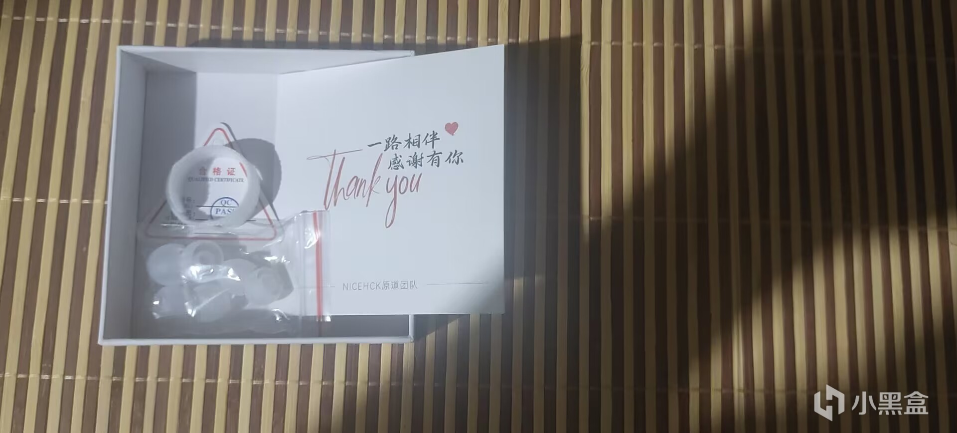 緊接着深入原道姬內部,發現裏面躺着一張祝福小卡片、一張三角形合格證和一張注意事項說明書,以及六個備用耳塞套。